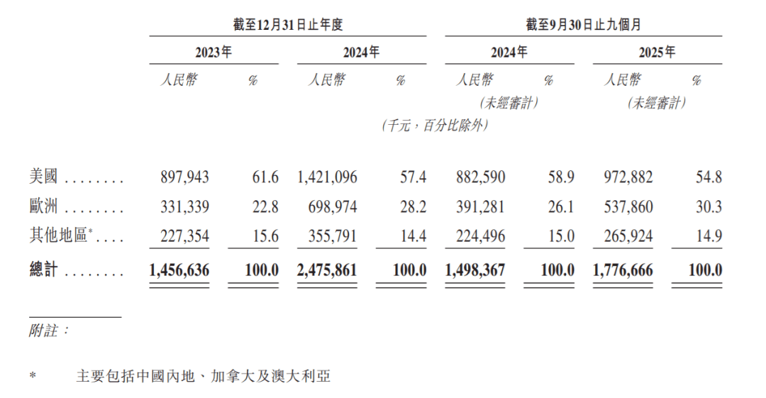 △按照市场地域划分,2025年1-9月,美国市场营收达9。7亿人平易近币,占54。8;欧洲5。3亿,占30。3%;中国内地、、等其它地域2。6亿,占14。9%。美国和欧洲占领85。1%,
